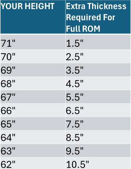 Since not all people of the same height will have the same ROM (due to length of legs/torso ratio….and general flexibility) I am merely extrapolating here. So - GENERALLY SPEAKING- this is what you would have to add to the THICKEN footplate (when it is at its most forward setting) to get a full ROM:
