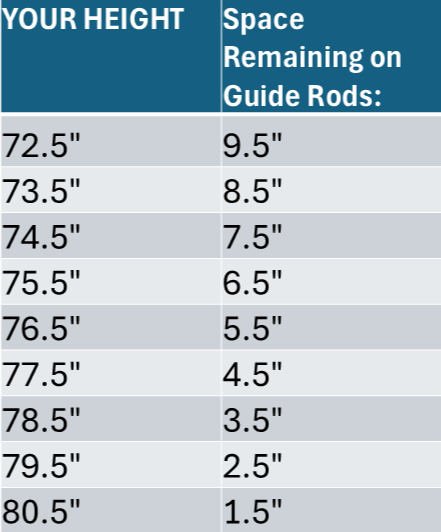 So with this fix (5’11” plus 1.5” of mat), I do get a full ROM and I still have 9.5” left on the guide rods. So If I am extrapolating here: These heights require no modifications and you still have the noted amount of space on the guide rods.